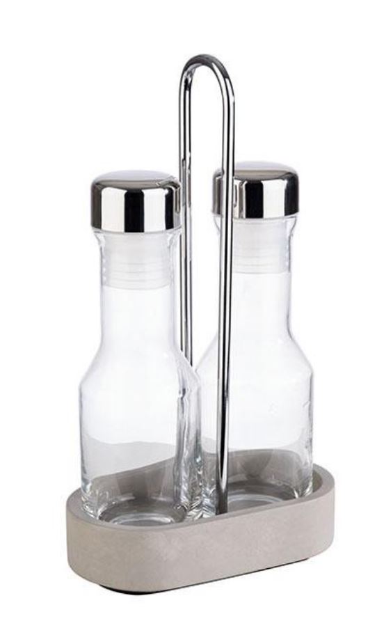 Olaj és ecet tartó "ELEMENT" beton talp, üveg, rm.acél fedővel 14x8cm mag:25cm