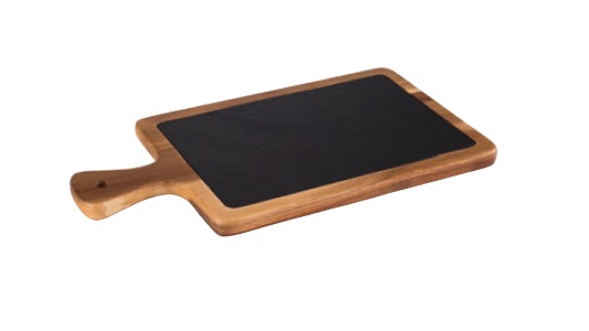 Tálaló fa lap pala tálcával, 26x18 cm, mag.: 2 cm - olajozott akácfa/pala tálca