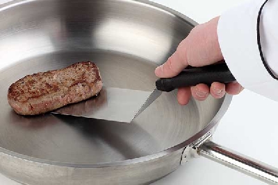 Spakli hajlított, 20x7,5cm, hossz:33cm, rm.acél, polipropilén nyél