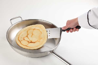 Spakli hajlított, perforált, 24x7,5cm, hossz.37,5cm, rm.acél, polipropilén nyél