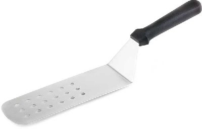 Spakli hajlított, perforált, 24x7,5cm, hossz.37,5cm, rm.acél, polipropilén nyél